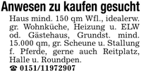 Anwesen zu kaufen gesuchtHaus mind. 150 qm Wfl., idealerw. gr. Wohnküche, Heizung u. ELW od. Gästehaus, Grundst. mind. 15.000 qm, gr. Scheune u. Stallung f. Pferde, gerne auch Reitplatz, Halle u. Roundpen._ ***