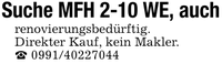 Suche MFH 2-10 WE, auchrenovierungsbedürftig.Direkter Kauf, kein Makler._ ***