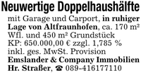Neuwertige Doppelhaushälftemit Garage und Carport, in ruhiger Lage von Altfraunhofen, ca. 170 m² Wfl. und 450 m² Grundstück KP: 650.000,00 € zzgl. 1,785 %inkl. ges. MwSt. Provision Emslander & Company Immobilien Hr. Straßer, _ ***
