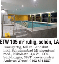 ETW 105 m² ruhig, schön, LAEinzigartig, toll in Landshut!inkl. Schwimmbad Miteigentum!mod., Nikolastr., 4,5 Zi, 1.OG,Süd-Loggia, 399T provisionsfreiAndreas Wenzel ***