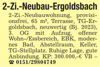 2-Zi.-Neubau-Ergoldsbach2-Zi.-Neubauwohnung, provisionsfrei, 65 m², Terrasse, TG-Ergoldsbach, neuwertig (Bj. 2023), 3. OG mit Aufzug, offener Wohn-/Essbereich, EBK, modernes Bad, Abstellraum, Keller, TG-Stellplatz. Ruhige Lage, gute Anbindung. KP: 300.000,-€ VB - _ ***