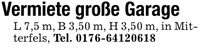 Vermiete große GarageL 7,5 m, B 3,50 m, H 3,50 m, in Mitterfels, Tel. ***