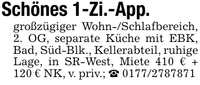 Schönes 1-Zi.-App.großzügiger Wohn-/Schlafbereich, 2. OG, separate Küche mit EBK, Bad, Süd-Blk., Kellerabteil, ruhige Lage, in SR-West, Miete 410 € + 120 € NK, v. priv.; _ ***