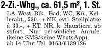 2-Zi.-Whg., ca. 61,5 m², 1. St.LA-West, Blk., Bad, WC, Kü., Kellerabt., 530.- + NK, evtl. Stellplätzeá 30.-, + KT, NR, k. Haustiere, ab sofort; Nur persönliche Anrufe, (keine SMS/keine WhatsApp),ab 14 Uhr: Tel. ***