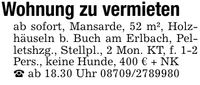 Wohnung zu vermietenab sofort, Mansarde, 52 m², Holzhäuseln b. Buch am Erlbach, Pelletshzg., Stellpl., 2 Mon. KT, f. 1-2 Pers., keine Hunde, 400 € + NK_ ab 18.30 Uhr ***