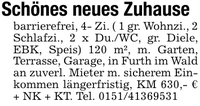 Schönes neues Zuhausebarrierefrei, 4- Zi. ( 1 gr. Wohnzi., 2 Schlafzi., 2 x Du./WC, gr. Diele, EBK, Speis) 120 m², m. Garten, Terrasse, Garage, in Furth im Wald an zuverl. Mieter m. sicherem Einkommen längerfristig, KM 630,- € + NK + KT. Tel. ***