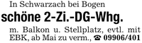 In Schwarzach bei Bogen schöne 2-Zi.-DG-Whg.m. Balkon u. Stellplatz, evtl. mit EBK, ab Mai zu verm., _ ***