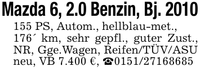 Mazda 6, 2.0 Benzin, Bj. *** PS, Autom., hellblau-met.,176' km, sehr gepfl., guter Zust., NR, Gge.Wagen, Reifen/TÜV/ASU neu, VB 7.400 €, _***