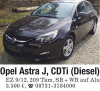 Opel Astra J, CDTi (Diesel) EZ 9/12, 209 Tkm, SR + WR auf Alu 3.500 €, _ ***