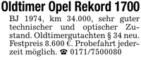 Oldtimer Opel Rekord 1700BJ 1974, km 34.000, sehr guter technischer und optischer Zustand. Oldtimergutachten § 34 neu. Festpreis 8.600 €. Probefahrt jederzeit möglich. _ ***