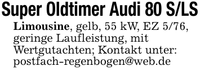 Super Oldtimer Audi 80 S/LSLimousine, gelb, 55 kW, EZ 5/76,geringe Laufleistung, mitWertgutachten; Kontakt unter:postfach-regenbogen@web.de