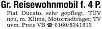 Gr. Reisewohnmobil f. 4 P. Fiat Ducato, sehr gepflegt, TÜV neu, m. Klima, Motorradträger, TV uvm. Preis VB _ ***