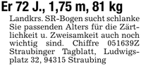 Er 72 J., 1,75 m, 81 kgLandkrs. SR-Bogen sucht schlanke Sie passenden Alters für die Zärtlichkeit u. Zweisamkeit auch noch wichtig sind. Chiffre ***Z Straubinger Tagblatt, Ludwigsplatz 32, 94315 Straubing