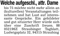 Welche aufgeschl., attr. Dame bis 75 möchte nicht mehr allein an (kulturellen) Veranstaltungen teilnehmen und hat Lust auf interessante Gespräche. Ein gebildeter und gut situierter Herr würde sich über eine Zuschrift freuen. _ ***Z Straubinger Tagblatt, Ludwigsplatz 32, 94315 Straubing