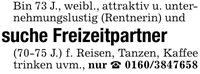 Bin 73 J., weibl., attraktiv u. unternehmungslustig (Rentnerin) und suche Freizeitpartner(70-75 J.) f. Reisen, Tanzen, Kaffee trinken uvm., nur _ ***