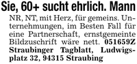 Sie, 60+ sucht ehrlich. MannNR, NT, mit Herz, für gemeins. Unternehmungen, im Besten Fall für eine Partnerschaft, ernstgemeinte Bildzuschrift wäre nett. ***Z Straubinger Tagblatt, Ludwigsplatz 32, 94315 Straubing