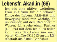 Lebensfr. Akad.in (66)Ich bin eine aktive, weltoffene Frau mit Sinn für die schönen Dinge des Lebens. Aktivität und Bewegung sind mir wichtig, ob im Camper, auf dem Rad oder im Wasser. Ich suche einen Partner (60 - 75) mit dem ich alles teilen kann, was das Leben uns noch bietet. Chiffre ***Z an die LZ, Altstadt 89, 84028 Landshut