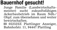 Bauernhof gesucht!Junge Familie (Landwirtschaftsmeister) sucht zukunftsfähigen Ackerbaubetrieb im Raum Ndb./ Obpf. zum übernehmen und weiter bewirtschaften._ ***Z Plattlinger Anzeiger, Bahnhofstr. 11, 94447 Plattling