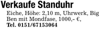 Verkaufe StanduhrEiche, Höhe: 2,10 m, Uhrwerk, Big Ben mit Mondfase, 1000,- €,Tel. ***