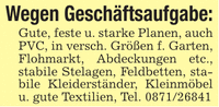 Wegen Geschäftsaufgabe:Gute, feste u. starke Planen, auch PVC, in versch. Größen f. Garten, Flohmarkt, Abdeckungen etc., stabile Stelagen, Feldbetten, stabile Kleiderständer, Kleinmöbel u. gute Textilien, Tel. ***