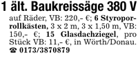1 ält. Baukreissäge 380 Vauf Räder, VB: 220,- €; 6 Styroporrollkästen, 3 x 2 m, 3 x 1,50 m, VB: 150,- €; 15 Glasdachziegel, pro Stück VB: 11,- €, in Wörth/Donau. _ ***