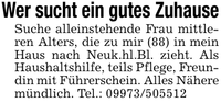Wer sucht ein gutes ZuhauseSuche alleinstehende Frau mittleren Alters, die zu mir (88) in mein Haus nach Neuk.hl.Bl. zieht. Als Haushaltshilfe, teils Pflege, Freundin mit Führerschein. Alles Nähere mündlich. Tel.: ***