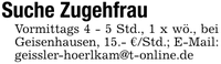 Suche ZugehfrauVormittags 4 - 5 Std., 1 x wö., bei Geisenhausen, 15.- €/Std.; E-Mail: geissler-hoerlkam@t-online.de