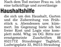 Nach dem Tod meiner Frau su. ich eine tatkräftige und zuverlässigeHaushaltshilfedie sich um den Haushalt, Garten und die Zubereitung von Frühstück u. Abendessen usw. kümmert. Im Gegenzug biete ich bei freier Kost und Logis eine komplett möbl. Whg. im OG. Bitte nur ernstgemeinte Zuschriften _ ***Z Straubinger Tagblatt, Ludwigsplatz 32, 94315 Straubing