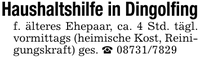 Haushaltshilfe in Dingolfing f. älteres Ehepaar, ca. 4 Std. tägl. vormittags (heimische Kost, Reinigungskraft) ges. _ ***