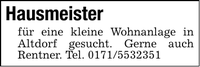 Hausmeisterfür eine kleine Wohnanlage in Altdorf gesucht. Gerne auch Rentner. Tel. ***