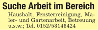 Suche Arbeit im BereichHaushalt, Fensterreinigung, Maler- und Gartenarbeit, Betreuung u.s.w.; Tel. ***
