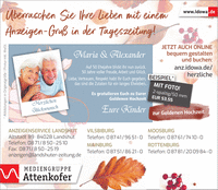 * Abbildungen in Originalgröße | Preise inkl. MwSt.zur Goldenen HochzeitMaria & AlexanderEure KinderJetzt auch online bequem gestalten und buchen: anz.idowa.de/ herzlicheAuf 50 Ehejahre blickt Ihr nun zurück. 50 Jahre voller Freude, Arbeit und Glück. Liebe, Vertrauen, Respekt habt Ihr Euch gegeben, das sind die Zutaten für ein langes Eheleben. Es gratulieren Euch zu Eurer Goldenen Hochzeit2-spaltig/50 mm EUR 53,55MIT FOTO!BEISPIEL*Herzlichen GlückwunschVilsbiburg Telefon: *** Mainburg Telefon: *** Moosburg Telefon: *** Ergoldsbach Telefon: *** Rottenburg Telefon: *** Anzeigenservice Landshut Altstadt *** Landshut Telefon: *** Fax: *** anzeigen@landshuter-zeitung.deAnzeigenservice Landshut Altstadt *** Landshut Telefon: *** Fax: *** anzeigen@landshuter-zeitung.deVilsbiburg Telefon: *** Mainburg Telefon: ***Moosburg Telefon: *** Rottenburg Telefon: ***