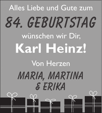 Von Herzen Maria, Martina & Erika84. GeburtstagAlles Liebe und Gute zumwünschen wir Dir, Karl Heinz!