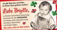 'Es gibt Tage hier auf Erden, an denen muss gefeiert werden.' Liebe Brigitte, zu Deinem besonderen Geburtstag wünschen Dir alle Sprengers von Herzen alles erdenklich Gute, viel Glück, Gesundheit und Gottes Segen. Wie schön, dass wir Dich haben!