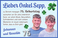 Lieber Onkel Sepp, zu Deinem morgigen 75. Geburtstag wünschen wir Dir alles erdenklich Gute, vor allem Glück, Gesundheit, Zufriedenheit und viele schöne Momente im neuen Lebensjahr. Schön, dass es Dich gibt!Johannes und Benedikt75
