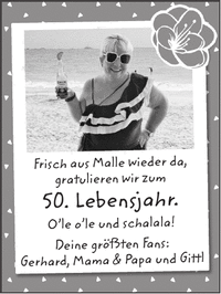 Frisch aus Malle wieder da, gratulieren wir zum 50. Lebensjahr. O'le o'le und schalala! Deine größten Fans: Gerhard, Mama & Papa und Gittl