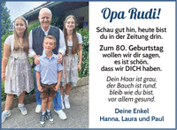 Opa Rudi! Schau gut hin, heute bist du in der Zeitung drin. Zum 80. Geburtstag wollen wir dir sagen, es ist schön, dass wir DICH haben. Dein Haar ist grau, der Bauch ist rund, bleib wie du bist, vor allem gesund. Deine Enkel Hanna, Laura und Paul