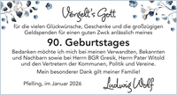 Vergelt's Gott für die vielen Glückwünsche, Geschenke und die großzügigen Geldspenden für einen guten Zwck anlässlich meines 90. Geburtstages Bedanken möchte ich mich bei meinen Verwandten, Bekannten und Nachbarn sowie bei Herrn BGR Gresik, Herrn Pater Witold und den Vertretern der Kommunen, Politik und Vereine. Mein besonderer Dank gilt meiner Familie! Pfelling, im Januar 2026 Ludwig Wolf