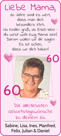 Liebe Mama, 60 Jahre sind es wert, dass man dich besonders ehrt. Ob Kinder groß, ob Enkel klein - du wirst wohl ewig Mama sein! Darum wollen wir dir sagen: Es ist schön, dass wir dich haben! 60 Die allerliebsten Geburtstagswünsche zu deinem 60. Sabine, Lisa, Ines, Manfred, Felix, Julian & Daniel 60
