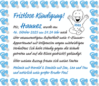 Fristlose Kündigung! Mir, Hannes, wurde am 16. Oktober 2025 um 21.24 Uhr nach über neunmonatigem Aufenthalt mein 1-Zimmer-Appartement mit Vollpension wegen mietwidrigen Verhaltens (ich habe ständig gegen die Wände getreten und auf die Blase gedrückt) gekündigt. Über meinen Auszug freuen sich meine Tanten Melanie mit Harald & Daniela mit Jan, Lea und Tom und natürlich mein großer Bruder Paul 3565