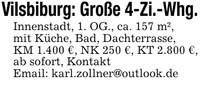 Vilsbiburg: Große 4-Zi.-Whg.Innenstadt, 1. OG., ca. 157 m²,mit Küche, Bad, Dachterrasse,KM 1.400 €, NK 250 €, KT 2.800 €, ab sofort, KontaktEmail: karl.zollner@outlook.de