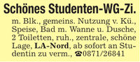Schönes Studenten-WG-Zi.m. Blk., gemeins. Nutzung v. Kü., Speise, Bad m. Wanne u. Dusche, 2 Toiletten, ruh., zentrale, schöne Lage, LA-Nord, ab sofort an Studentin zu verm., _***
