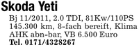 Skoda Yeti Bj ***, 2.0 TDI, 81Kw/110PS145.300 km, 8-fach bereift, Klima AHK abn-bar, VB 6.500 EuroTel. ***