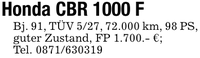 Honda CBR 1000 FBj. 91, TÜV 5/27, 72.000 km, 98 PS, guter Zustand, FP 1.700.- €;Tel. ***