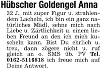Hübscher Goldengel Anna 32 J., mit super Figur u. strahlendem Lächeln, ich bin ein ganz natürliches Mädl, sehne mich nach Liebe u. Zärtlichkeit u. einem lieben Freund an den ich mich kuscheln kann. Bist Du ehrlich u. treu, dann zögere nicht u. ruf gleich an o. SMS üb. PV Tel. *** ich freue mich auf Deine Antwort.