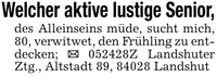 Welcher aktive lustige Senior,des Alleinseins müde, sucht mich, 80, verwitwet, den Frühling zu entdecken; _ ***Z Landshuter Ztg., Altstadt 89, 84028 Landshut