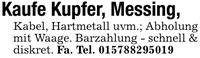 Kaufe Kupfer, Messing,Kabel, Hartmetall uvm.; Abholung mit Waage. Barzahlung - schnell & diskret. Fa. Tel. ***