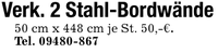 Verk. 2 Stahl-Bordwände50 cm x 448 cm je St. 50,-€.Tel. ***