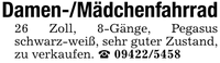Damen-/Mädchenfahrrad26 Zoll, 8-Gänge, Pegasus schwarz-weiß, sehr guter Zustand, zu verkaufen. _ ***