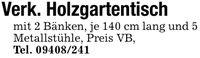 Verk. Holzgartentischmit 2 Bänken, je 140 cm lang und 5 Metallstühle, Preis VB,Tel. ***